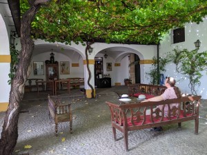 Jerez turned out to be a lot hillier than we’d realized, so by the time we’d walked to the bodega, we were hot and out of breath. Luckily, just inside the gate they had a wonderful terrace draped in vines.