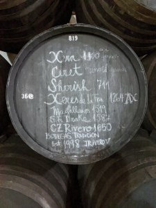 Though the ceilings and windows are very high in order to let the special wind enter and circulate, the barrels are not stacked more than three high. The youngest sherry is on the top, and a few times a year they take a portion from the uppermost row and mix it with the next one down and so on. When people talk about the “age” of a sherry, it refers to the oldest known batch in the mix, though sometimes these same batches can have even older parts from previous blends. So sherry labels look a little something like this: